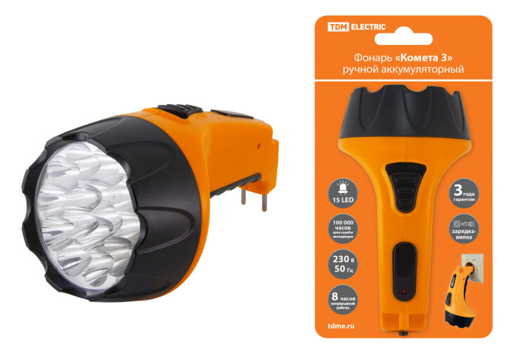 Фонарь «Комета 3» ручной аккумуляторный, 15 светодиодов, 1,1Ач 230В вилка, TDM