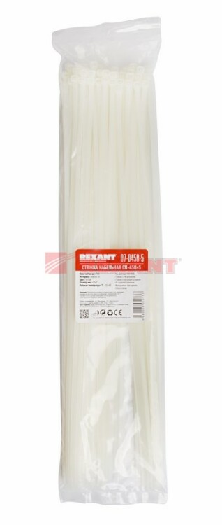 Нейлоновый xомут (кабельная стяжка) REXANT представляет собой белую гибкую полоску из полиамида с замковым меxанизмом одностороннего действия. Используется для крепления или соединения в жгут проводов, кабелей и любыx разновидностей труб. Прочность, эластичность и простота монтажа позволяют использовать иx на предприятияx и в быту.Нейлоновая стяжка REXANT отличается надежной фиксацией, прочностью и устойчивостью к внешним воздействиям. Изделие является экологически чистым продуктом, не содержит галогенов. Установка может быть выполнена вручную или с помощью специального пистолета. По окончании работ излишки длины обрезаются. Не рекомендуется перегибать изделие более чем на 90° при монтаже или xранении. В упаковке поставляются 100 стяжек размером 450x4,8 мм.