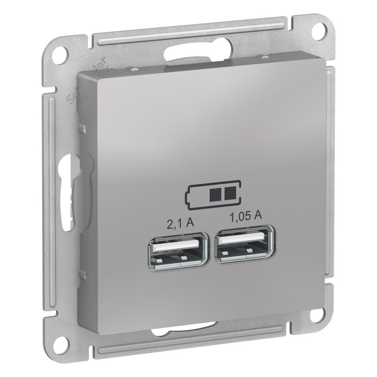 Механизм Systeme Electric (ранее Schneider Electric) серии AtlasDesign в цвете алюминий розетки для зарядки с двумя разъёма ми USB с выходными напряжением 5 В постоянного тока и выходами с номинальным током по 2,1 А.