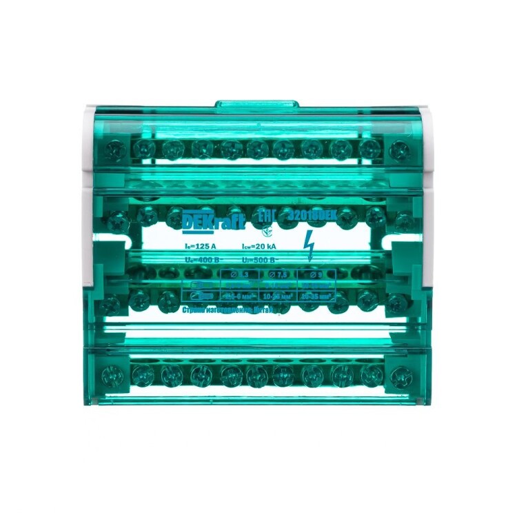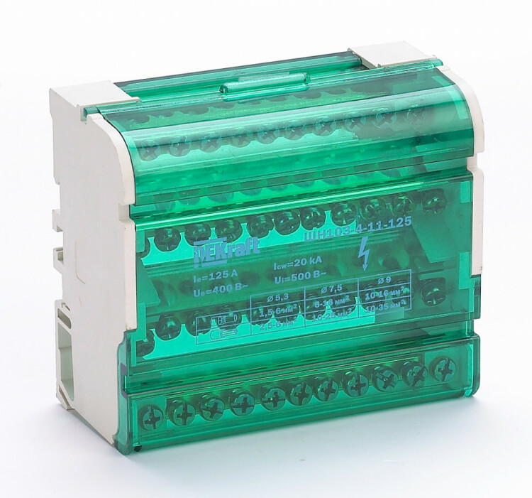 Кросс-модуль серии ШН-103 Dekraft; номинальный ток - 125 А; исполнение – 4 ряда по 11 отверстий (7х5,3 + 2x7,5 + 2x9,0); материал корпуса – нагревостойкий пластик; материал шин – высококачественная электротехническая бронза; каждая шина отдельно изолирована; цвет крышки – зеленый; установка – на DIN-рейку 35 мм или на монтажную панель двумя винтами M4; степень защиты - IP20. Применение кросс-модулей в щите обеспечивает компактную разводку кабелей и защиту от прикосновения к токоведущим частям.