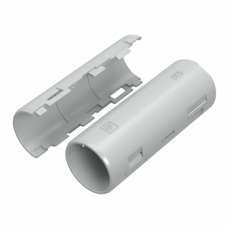 Муфта разборная позволяет соединять гофрированные и гладкие трубы различных типоразмеров без использования специальных инструментов, как при прокладке проложенной кабеленесущей трассе вновь, так и по ранее смонтированной системе труб, в том числе с переходом с гофрированной трубы на гладкую одного типоразмера.
