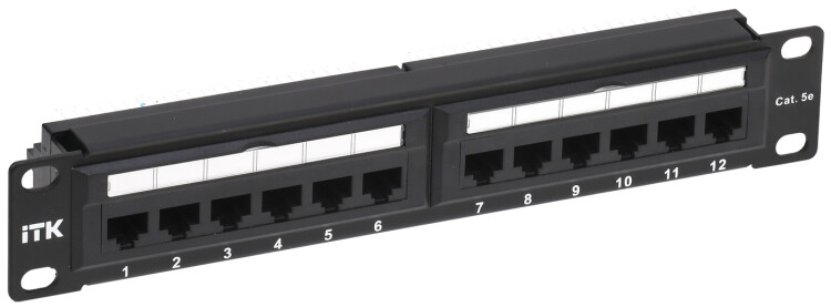Коммутационные панели или патч-панели являются важнейшей частью любой СКС и IT-инфраструктуры здания и сооружения с большим количеством информационных розеток и терминальных портов конечных пользователей, которые необходимо коммутировать на порты активного сетевого оборудования, размещенного в серверных и распределительных узлах. В зависимости от способа крепления, масштабности кабельной системы, типа сети ITK изготавливает патч-панели для монтажа в 10-дюймовый конструктив, по количеству портов: 8-, 12-, категорий: 5E, 6, 6A, в экранированном исполнении и без защитного экрана. Патч-панели для монтажа в шкаф 10" (254мм) имеют отверстия с левой и правой стороны для крепления на профиль, производятся высотой 0,5 или 1 юнит. На передней стороне все патч-панели ITK имеют специальную площадку для дополнительной маркировки и цифровую нумерацию портов. На обратной стороне модули IDC имеют цветовую и цифровую нумерацию. Также для облегчения монтажа и укладки кабелей выпускаются модификации с кабельным органайзером. Патч-панели соответствуют международным стандартам UL 1863, ISO/IEC 11801:2002, TIA/EIA-568-B, кодировка проводников в соответствии с T568B и A. Поставляются в картонной коробке с крепежом.