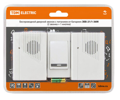 Применение:Используются в качестве дверных звонков или устройств внутреннего вызова. Преимущества:Бюджетное предложение на электротехническом рынке.Дальность работы беспроводных звонков 100-300 метров (на открытом пространстве).В ряде моделей имеется возможность разместить на кнопке номер квартиры и/или фамилию хозяина.В ряде моделей пользователь имеет возможность изменения кода звонка при порче/утере старой кнопки или для подключения дополнительной кнопки.В ассортименте имеются отдельно кнопки для проводных и беспроводных звонков, что позволит произвести замену при порче старой кнопки.Ряд моделей имеет кнопки со степенью защиты IP44, которые можно устанавливать на улице.Имеются исполнения с 2-мя кнопками (для разных выходов из дома) и с 2-мя звонками (для разных этажей или зданий: дом, гараж).Звонки упакованы в яркую блистерную упаковку, оформленную в корпоративных цветах TDM ELECTRIC, на каждом блистере есть информационные пиктограммы с характеристиками звонков.0: Применение:Используются в качестве дверных звонков или устройств внутреннего вызова. Преимущества:Бюджетное предложение на электротехническом рынке.Дальность работы беспроводных звонков 100-300 метров (на открытом пространстве).В ряде моделей имеется возможность разместить на кнопке номер квартиры и/или фамилию хозяина.В ряде моделей пользователь имеет возможность изменения кода звонка при порче/утере старой кнопки или для подключения дополнительной кнопки.В ассортименте имеются отдельно кнопки для проводных и беспроводных звонков, что позволит произвести замену при порче старой кнопки.Ряд моделей имеет кнопки со степенью защиты IP44, которые можно устанавливать на улице.Имеются исполнения с 2-мя кнопками (для разных выходов из дома) и с 2-мя звонками (для разных этажей или зданий: дом, гараж).Звонки упакованы в яркую блистерную упаковку, оформленную в корпоративных цветах TDM ELECTRIC, на каждом блистере есть информационные пиктограммы с характеристиками звонков.