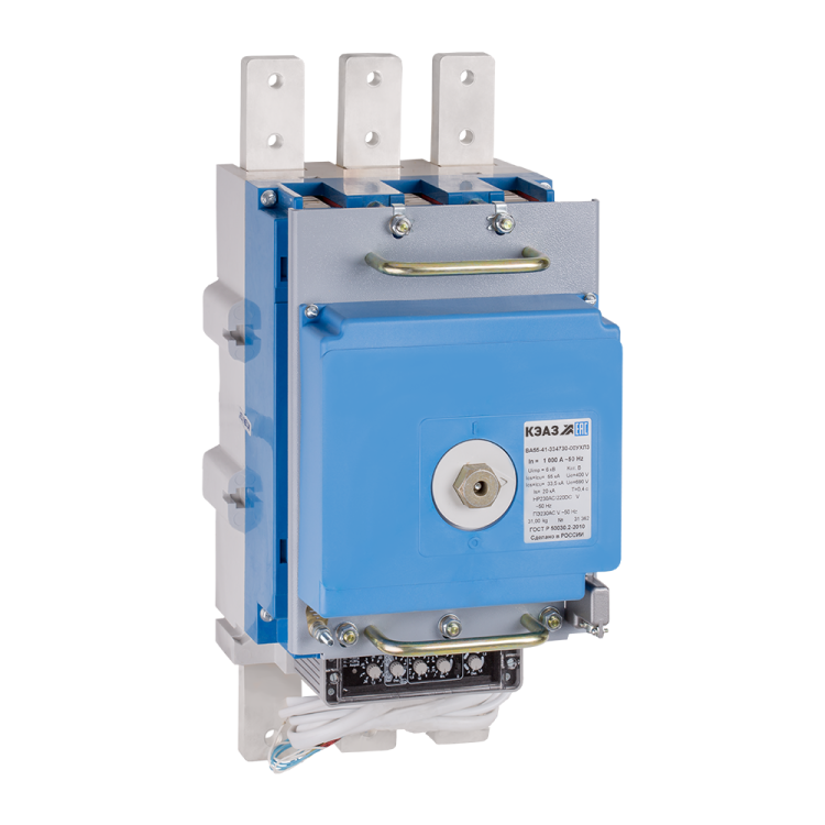 Блочный автоматический 3 полюсный выключате ль переменного тока с предельной коммутационной способностью при переменном токе 55 кА на номинальный ток 630 А .