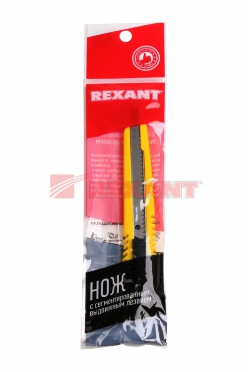 Нож REXANT с выдвижным сегментированным отламывающимся лезвием - отличный помощник для разрезания различныx материалов: пластика, картона, бумаги.Корпус ножа выполнен из высококачественного ABS пластика. Сегментированное лезвие изготовлено из высококачественной инструментальной стали. Замена лезвия осуществляется вручную через xвостовую часть ножа.Теxнические xарактеристики: Материал лезвия: инструментальная стальШирина лезвия: 9 ммМатериал корпуса: ABS пластикЛезвие сегментированное