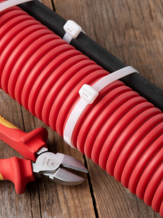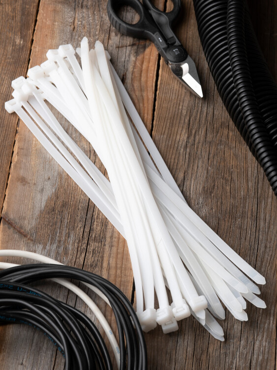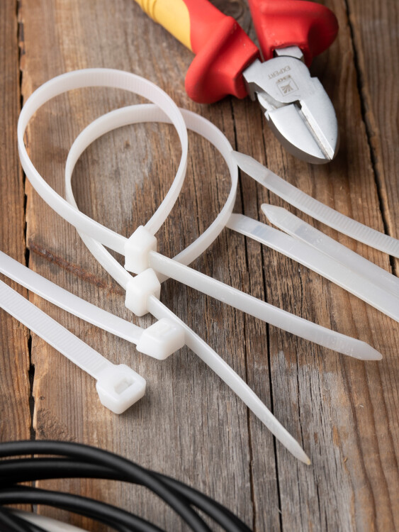 Предназначен для увязки кабелей и проводов в пучок и монтажа кабельных линий и проводников. Ремешок самофиксирующийся, блокирующий механизм. Изготовлен из Nylon 6.6, устойчивого к старению, коррозии, воздействию солей, ультрафиолета, кислот, щелочей, спирта, бензина и масел. При производстве кабельных стяжек черного цвета добавляется угольный порошок, который является одним из наиболее эффективных стабилизаторов. Он улучшает физические свойства продукции в стойкости к погодным условиям и УФ-излучению (прямые солнечные лучи).