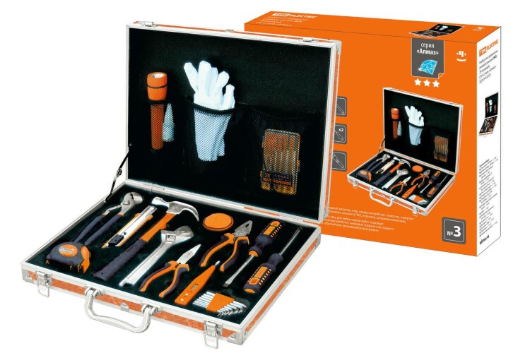 Материалы:Чемодан, рукоятки ПВХ, мягкая резина, алюминий.Металлические части состава инструментальная и хром-ванадиевая сталь. Преимущества:Качественная сталь.Оптимальное сочетание инструментов в набореУдобное хранение необходимых инструментовИнструменты в наборе выдерживают повышенные нагрузкиИнформативная красочная упаковка со штрихкодом наглядно представляет содержимое набораНазначение:Наборы предназначены для выполнения широкого круга работ при ремонте, монтаже, регулировке машин и различного оборудования. 0: Материалы:Чемодан, рукоятки ПВХ, мягкая резина, алюминий.Металлические части состава инструментальная и хром-ванад иевая сталь.