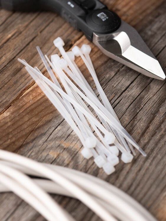 Предназначен для увязки кабелей и проводов в пучок и монтажа кабельных линий и проводников. Ремешок самофиксирующийся, блокирующий механизм. Изготовлен из Nylon 6.6, устойчивого к старению, коррозии, воздействию солей, ультрафиолета, кислот, щелочей, спирта, бензина и масел. При производстве кабельных стяжек черного цвета добавляется угольный порошок, который является одним из наиболее эффективных стабилизаторов. Он улучшает физические свойства продукции в стойкости к погодным условиям и УФ-излучению (прямые солнечные лучи).