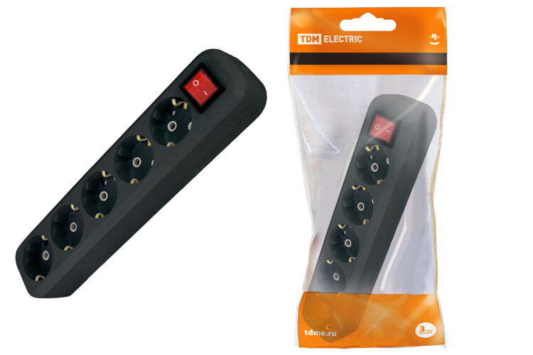 Колодка 5 гнезд с/з с выключателем 16А 250В черная TDM (8/80шт)