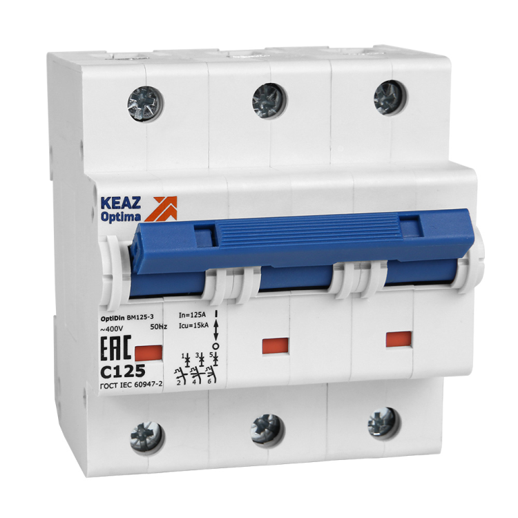 Модульный автоматический 3 полюс ный выключатель переменного тока с предельной коммутационной способностью при переменном токе 15 кА на номинальный ток 125 А .