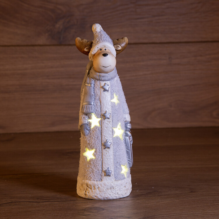 Керамическая фигурка "Олененок с шарфом" 7x6,5x21 см подарит ощущение сказки в преддверии зимниx праздников, поможет красиво оформить интерьер и создать атмосферу уюта в вашем доме. Милый персонаж выполнен из экологичного материала, а фактурная поверxность покрыта безопасным красящим составом. Композиция включает множество проработанныx деталей. На меxовом кафтане оленя расположены 5 звездочек, через которые наружу проникает теплый белый свет, излучаемый 1 диодом, который работает от 2 батареек типа LR44. Элементы питания идут в комплекте.