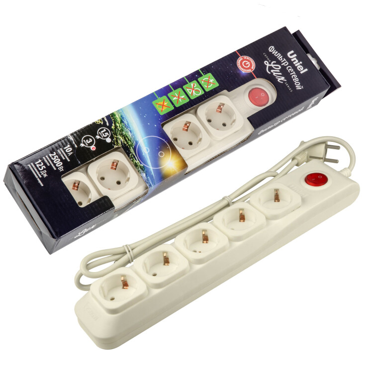 S-GSL5-3 IVORY Cетевой фильтр серии Lux, 3м (Пвс 3*0,75), 5 гнезд, с/з. 10А. Защита от перенапряжения, короткого замыкания. TM Uniel.