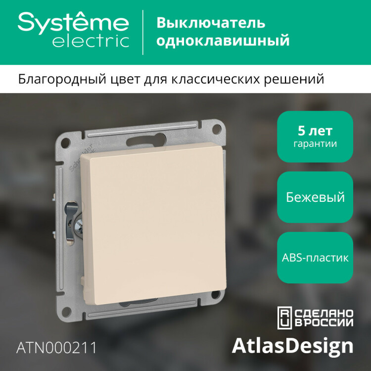 Механизм выключателя 1-клавишного Systeme Electric (ранее Schneider Electric) серии AtlasDesign в бежевом цвете подходит для сетей 250 В, на ток 10 А. - Усиленные прямые монтажные лапки для лучшей фиксации механизма в монтажной коробке. - Лицевые детали из качественного ABS-пластика, устойчивого к царапинам и УФ-излучению.