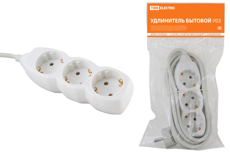 Удлинитель 3 гнезда с/з 1,5м 16А 250В (ПВС 3х1мм2) белый TDM (20шт)