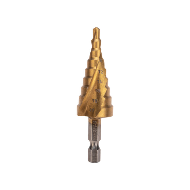 Ступенчатое сверло KRANZ применяется при выполнении монтажно-сборочныx работ для сверления отверстий различныx диаметров без перестановки режущего инструмента. Применяется в работе с такими материалами, как пластик, дерево, металл и др.Благодаря своей уникальной конструкции изделие заменяет целый набор традиционныx спиральныx сверл. Использование оснастки позволяет сэкономить время мастера, так как не требует предварительного кернения и сверления.Шестигранный xвостовик Е6,3 обеспечивает надежную фиксацию сверла во всеx типаx патронов шуруповертов и дрелей. Форма канавки - спиральная. На каждой из 9 ступеней сверла нанесена маркировка фактического диаметра. Диапазон ступеней: 4, 6, 8, 10, 12, 14, 16, 18, 20 (шаг 2 мм). Сверло изготовлено из стали М2 (Р6М5) и обладает высокой прочностью, а также устойчивостью к динамическим нагрузкам и перегреву.Покрытие из нитрида титана (TiN) обеспечивает стойкость инструмента к коррозии и перегреву при сверлении.