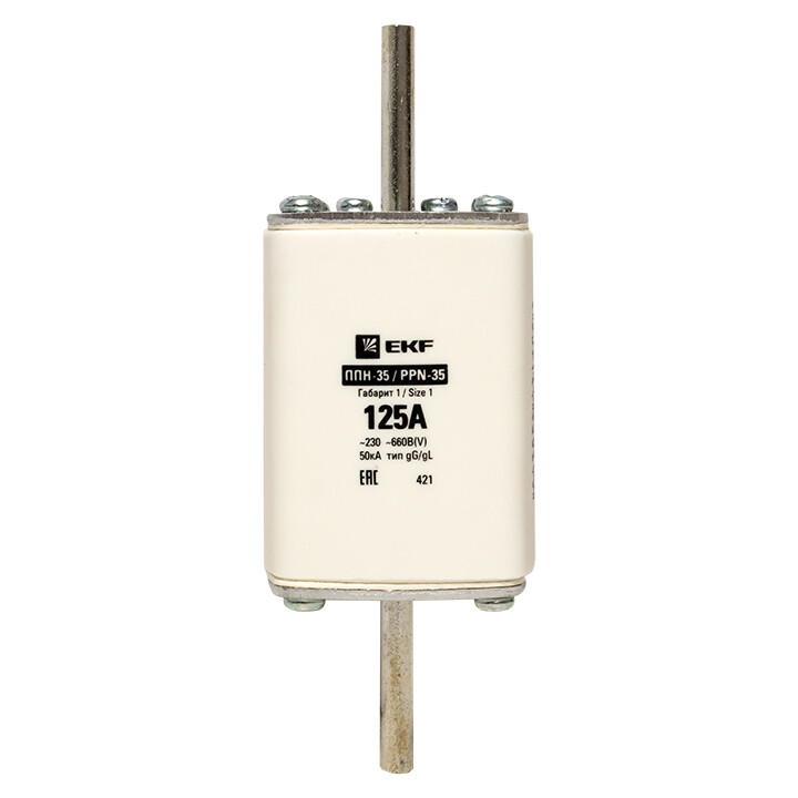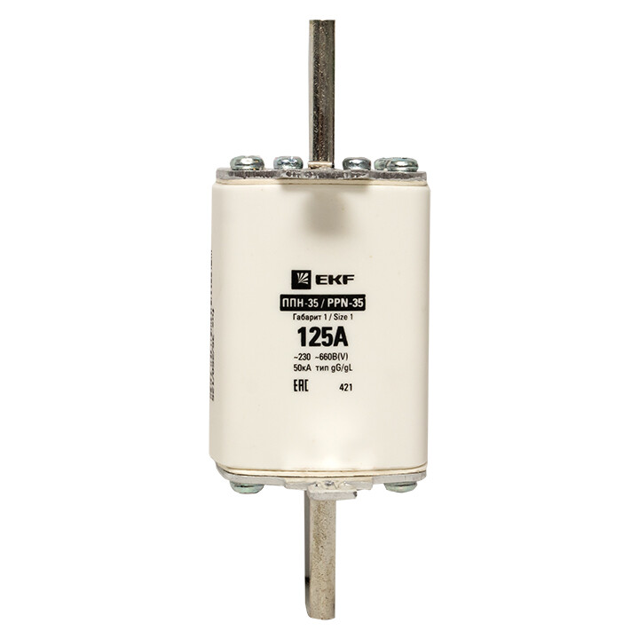 Плавкая вставка ППН-35 250/125А габарит 1 EKF. Предохранители плавкие ППН EKF, укомплектованные плавкими вставками типа gG/gL, предназначаются для защиты кабельных линий и промышленных электроустановок от токов перегрузки и короткого замыкания. Предохранители применяются в электрических сетях переменного тока частотой 50 Гц с напряжением до 660В. Применяются для крепления в распределительных и вводно-распределительных устройствах. Предохранители плавкие ППН могут устанавливаться в основание с держателем, а также в специально предназначенные рубильники. В комплект поставки предохранителей плавких ППН основание с держателем не входит и приобретается отдельно.