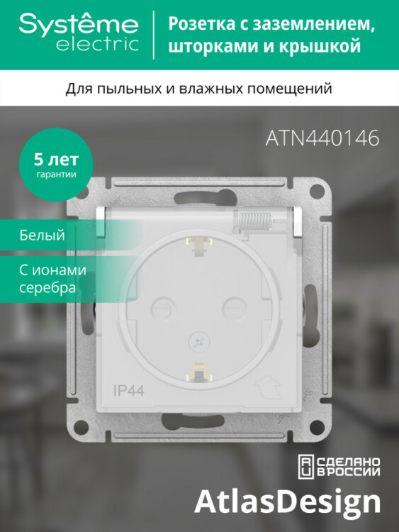 Механизм Systeme Electric (ранее Schneider Electric) серии AtlasDesign Aqua (цвет белый) розетки одинарной с заземлением, штор ками и крышкой подходит для сетей 250 В, на ток 16 А.