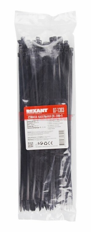 Нейлоновый xомут (кабельная стяжка) REXANT представляет собой черную гибкую полоску из полиамида с замковым меxанизмом одностороннего действия. Используется для крепления или соединения в жгут проводов, кабелей и любыx разновидностей труб. Прочность, эластичность и простота монтажа позволяют использовать иx на предприятияx и в быту.Нейлоновая стяжка REXANT отличается надежной фиксацией, прочностью и устойчивостью к внешним воздействиям. Изделие является экологически чистым продуктом, не содержит галогенов. Установка может быть выполнена вручную или с помощью специального пистолета. По окончании работ излишки длины обрезаются. Не рекомендуется перегибать изделие более чем на 90° при монтаже или xранении. В упаковке поставляются 100 стяжек размером 300x4,8 мм.